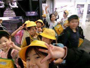 ・・・岐阜市科学館では、プラネタリウムの後に班の仲間と一緒に展示室を周りました。ちょうどたくさんの園児の見学と重なってしまいましたが、「小さい子を先にやらせてあげよう」とあちこちで『よびかけ』の声が聞こえました。時間がなくて、自分たちは十分に体験できたとは言えませんでしたが、みんな『やさしい』顔をして、科学館を後にしました。航空宇宙博物館では、飛行機やロケットなどの実物展示に、「すごい!」「大きい!」と歓声があがりました。広い所に来ると、思わず走ってしまう子がいましたが、「歩いて!」とすぐに声をかけて『ルールを守ろう』と意識し『よびかけて』いました。他にも、様々な場面で、仲間に関わって活動する姿がたくさん見られました。・・・