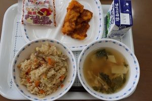 ・あきのすまし汁 ・ちくわのもみじあげ ・あき見つけごはん ・さつまいもとくりのタルト ・牛乳