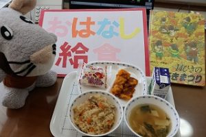 9月30日の給食は、子どもたちが楽しみにしている「お話給食」でした。今回は、図書館にもある絵本「14ひきのあきまつり」(いわむら かずお著、童心社)を題材に、栄養教諭の山田先生が考えたメニューです。