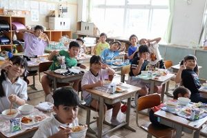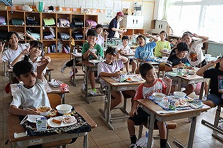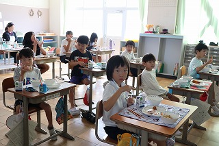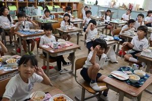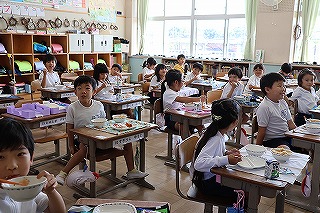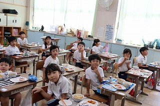 放送後、カメラを持って教室を周ると、いくつかの学級では、ほとんど給食を食べてしまった後でした。楽しくて、おいしくて、笑顔になる給食だから、どの教室を訪れても明るい雰囲気であふれていました。栄養教諭の山田先生は、「栄養面や衛生面はもちろんですが、子どもたちが喜んでくれるといいなと思いながら献立を考えています。私もそれがとても楽しいし、やりがいがあります。」と話しています。しあわせをつくる学校給食。これからも楽しみにしていてください。