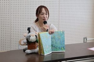 図書館の藤澤先生は、給食時の校内テレビ放送で、「14ひきのあきまつり」のお話を子どもたちに紹介しました。