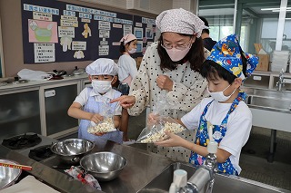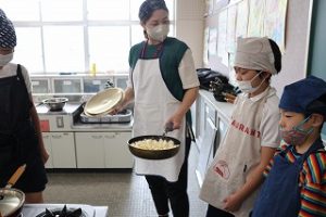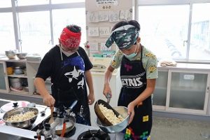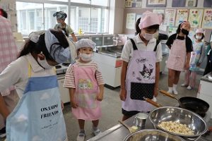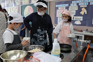 くりの実お楽しみ会では、子どもたちが「ポップコーンを作りたい!」と決め、先生たちが見守る中、異学年での調理を行いました。火を使う場面もあるので注意が必要でしたが、「こうすればいいよ。」「やってみるから見ていて。」「そう、その調子。」など自然であたたかい会話がたくさん生まれました。そして美味しいポップコーンができた喜びや食べる楽しさを一緒に感じることができました。