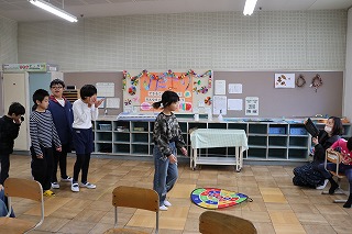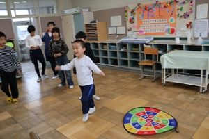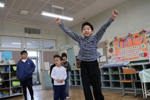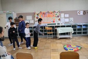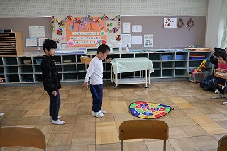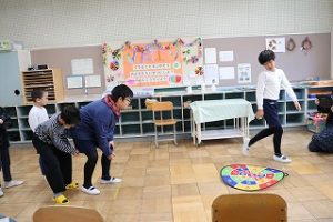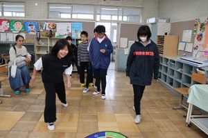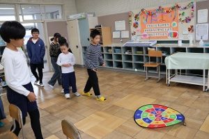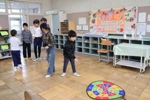 くりの実2組の教室をのぞくと、下羽栗で暮らす仲間同士、数の学習をしながら的あてゲームを楽しむ子どもたちの姿がありました。的をめがけてくっつきボールを投げると点数がわかります。「やった~!」「おしい!」「よっしゃ~」という掛け声と笑い声が教室を満たしていました。