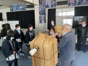 子どもたちは、現代風に食べやすくアレンジされた鮎鮨を試食し、法被(はっぴ)を着て荷を担ぐ体験をしました。毎年、6月頃には鮎鮨ウォークイベントが行われます。今年度も下羽栗小学校から何人かの子どもたちが鮎鮨ウォークに参加していますが、今回歴史を学んだ5年生からも来年度たくさん参加できるとよいと思います。
