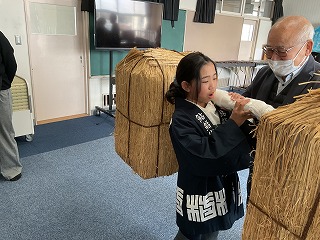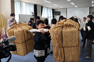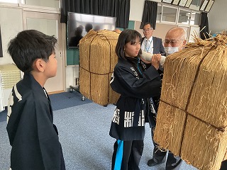 子どもたちは、現代風に食べやすくアレンジされた鮎鮨を試食し、法被(はっぴ)を着て荷を担ぐ体験をしました。毎年、6月頃には鮎鮨ウォークイベントが行われます。今年度も下羽栗小学校から何人かの子どもたちが鮎鮨ウォークに参加していますが、今回歴史を学んだ5年生からも来年度たくさん参加できるとよいと思います。